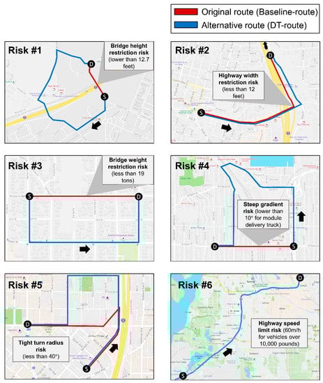 As shown in Figure 3, 6 risk types and a total of 12 risk points were detected from logistics simulation in the digital twin. One important fact here is that it is not possible to show all possible logistics risks because risks vary depending on current traffic conditions which change over time. The risks shown in the results give examples of possible risks posed to the case project at a specific time on a particular day. Such hard to predict risks can occur after planning. These risks should be continuously identified and avoided through real-time logistics simulation. In order to indicate the moving direction of the truck, the starting point was marked as ‘S’, and the destination point was marked as ‘D’ in the Figure 3. The red line shows the baseline-route and the blue line shows the alternative route (DT-route) found by the digital twin.