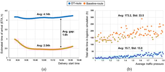 In addition, one important result to note is that logistics risks were explored in near real-time and delivery route and ETA were accurately updated accordingly throughout the logistics process. Also, Figure 4b shows that the DT-route spurs less idle time and standard deviation than the baseline-route in different traffic conditions, which implicates that idle time in logistics can be reduced when ETA is updated in real-time even though average traffic pressure changes.