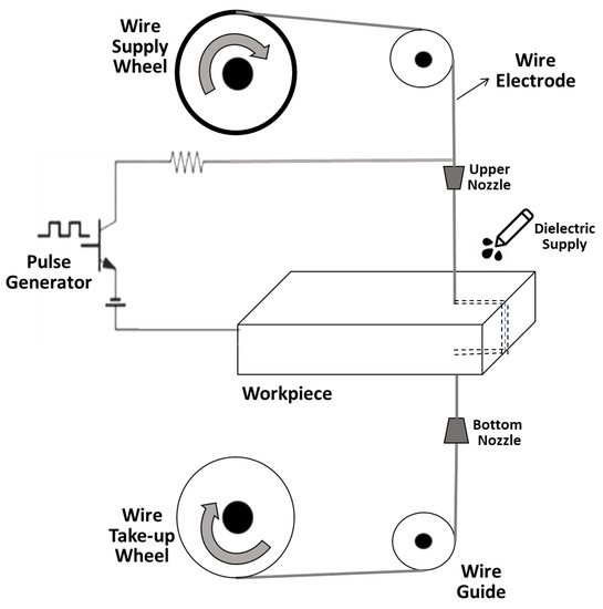 WEDM is a thermo-electrical process that can produce complex 2D and 3D shapes from electrically conductive workpieces by using sparks of electrical discharges. The schematic diagram of a WEDM machine is shown in