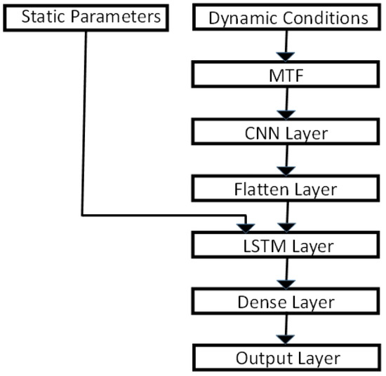 Figure 6. Note that the combination of the CNN and the LSTM neural network is called the CLSTM neural network. This is why the proposed method is called the MTF-CLSTM method. MTF-CLSTM uses the MTF model to represent dynamic WEDM manufacturing conditions as images. It then uses the CNN network to extract features of the images. The LSTM network then takes the features along with static machining parameters as the input data for predicting WEDM workpiece surface roughness. Note that we use the LSTM network rather than other models, as it is useful for identifying the relationship between input data points that may be far apart.