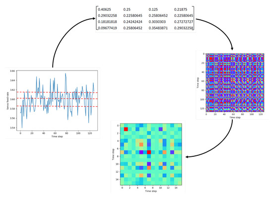 In the above equation, , and is the probability that state of data point at time step k transits to state of data point at time step l. Compared with the Markov transition matrix, the Markov transition field has extra temporal information besides state transition probabilities. It is thus more suitable for representing and extracting features of time series. For a time series of a large number n of data points, its associated Markov transition field is a large matrix, which is usually regarded as an image for the purpose of analyzing and visualizing.