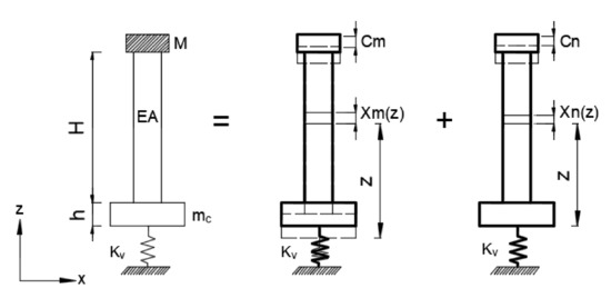 Because of the pile side resistance, the pile end resistance, and the compressive capability of concrete, the pile foundation has vertical stiffness. The stiffness also acts on the pier bottom and gives the pier bottom a specific vertical restraint stiffness . In the condition of the bare pier, the constraint stiffness can be expressed by vertical translational spring, and the top of the pier is unconstrained. As shown in Figure 1, the pier displacement caused by vertical vibration consists of two parts: the pier’s vertical translation and the pier’s vertical deformation . The vertical translation amplitude and the vertical deformation amplitude of the pier are expressed as and , respectively.