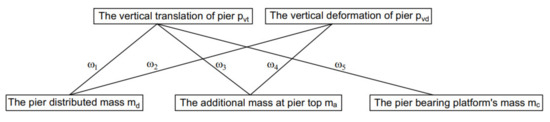 where is the fundamental frequency formed by the combination of the pier distributed mass and the vertical pier translation , is the fundamental frequency formed by the combination of and the vertical deformation , is the combination of the additional mass at the pier top and , is the combination of and , and is the combination of the pier cap’s mass and .