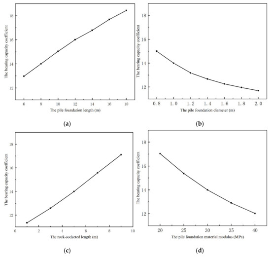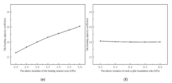 It can be seen from Figure 3 that the pile length, socketed depth, and pile modulus have a more significant impact on the bearing capacity coefficient, while the pile diameter and the bearing stratum rock modulus have a smaller influence. By comparison, the pile side rock modulus has no apparent impact on the bearing capacity coefficient, which is also the reason that rock-socketed piles are mostly end bearing piles.