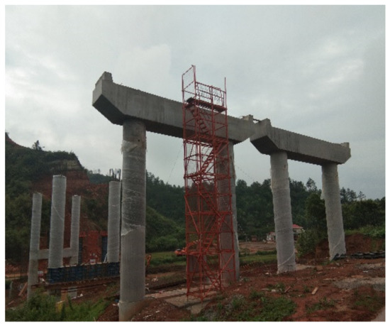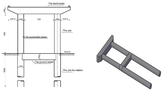 The background engineering is a uniform cross-section circular bridge pier of C40 concrete. The pier height is and the diameter is. The pile foundation is a bored cast-in-place pile, the length of the pile is and the diameter is . The elevation of the test pier and pile is shown in Figure 4. The test pier is a double-pier column form, and the bent beam is consolidated with the piers at the pier top. The pier is consolidated with the pile foundation, and a ground beam connects the two pile foundations.