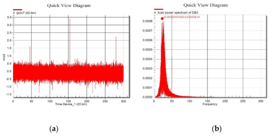Figure 6a shows the test bridge pier shaft to the acceleration time history diagram; using a filter to remove high- and low-frequency signal components and process the data by fast Fourier transformation, the frequency within the power spectral density curve was obtained, as shown in Figure 6b. The power spectrum peaks were determined by the frequency of each corresponding order of natural frequency. The first peak point was the fundamental frequency of the measured pier structure.