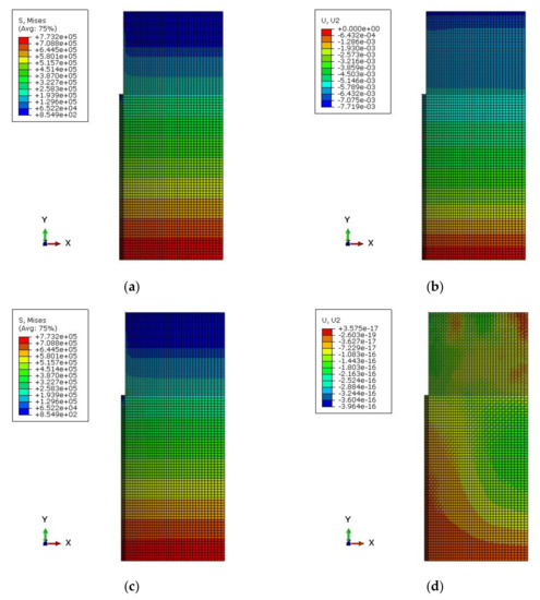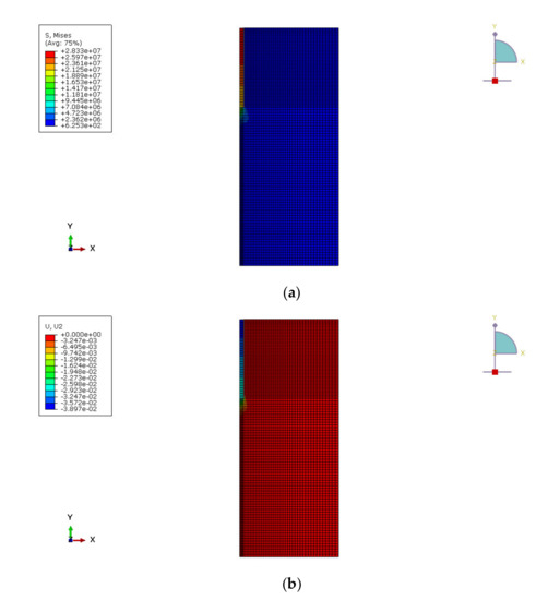 The initial equilibrium state of the pile rock-soil stratum system was established by the automatic ground stress balance step. Figure 7a,b show the distributions of stress and displacement before the initial stress equilibrium. Figure 7c,d show the distributions of stress and displacement after the initial stress equilibrium. Through comparison, it can be seen that the magnitude of stress remained unchanged after the stress equilibrium, and the magnitude of maximum displacement was 1 × 10−16 (m). Thus, the results of the initial ground stress equilibrium are precise enough for the finite element simulation.