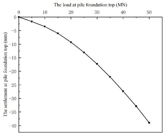 Figure 8a,b show the stress and the settlement of the pile top under a 50 MN load. The maximum stress in the pile was 28.33 MPa, and the maximum settlement at the pile top was 38.9 mm. The settlement of the pile top under different load levels was calculated, and the relationship between the settlement and the corresponding load is shown in Figure 9.