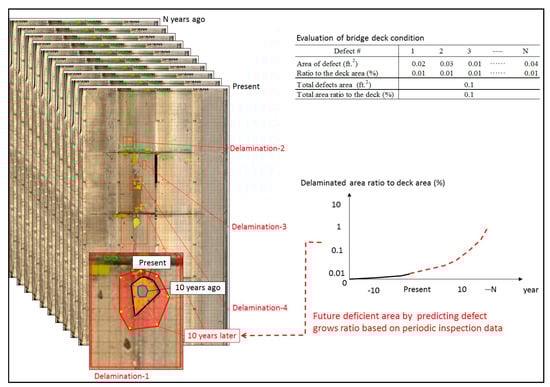 The implementation of proper infrastructure management has become crucial due to the fact that the US infrastructure has deteriorated significantly in the last decade. Advanced remediation strategies for deteriorated infrastructures are being developed using certain decision-making models in order to maintain the optimal funding use and remediation time []. To prevent the impending degradation of bridges, utilizing novel technologies for periodic inspection, assessment, and better management for proper maintenance has become more critical. Although the inclination to use conventional inspection methods still persists, advanced sensing technologies have the ability to better understand the current condition with more resolution and accuracy []. For this reason, better utilization of NDE as routine inspection practice becomes necessary. Optimized decision making based on the NDE input can be carried out by integrating utilization solutions to bridge management frameworks. Karaaslan (2018) designed a decision support framework to retrieve information from novel NDE techniques including vision-based technologies (e.g., infrared thermography, other imagery data) and perform network-level decision analysis using both NBI’s inputs and automatically retrieved inspection data from NDE []. The framework implemented a condition prediction methodology introduced by Hiasa et al. (2018) []. The methodology used the infrared thermography (IRT) data from the deck surface collected over a period of 10 years to provide critical information on how local delamination can potentially impact the integrity of the overall structure, as described in Figure 2. It will be possible to conduct time history prediction on the data to determine the optimal timeline of the necessary maintenance/repair actions.