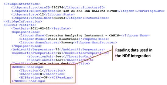 Effective utilization of NDE data is important for the decision support system to generate objective and reliable decision strategies. The quantified information from NDE can be utilized by machine learning models to make very accurate predictions. The goal in integrating NDE data into the bridge management framework is primarily to overlay the local defects on the bridge components and use the converted data in the LSTM model for defect growth prediction. To integrate the NDE data in the system, the data frames are encoded in XML format, which is also compatible with FHWA’s Robotics Assisted Bridge Inspection Tool (RABIT™) []. As shown in Figure 5, the data frame is composed of header information about the structure and the readings with x and y locations.
