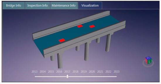 A standardized format for NDE data is important for successful communication between different technologies. However, with many types of NDE equipment, manufacturers, data formats, creating such a standardized format is difficult in the near term. Over time, manufacturers will start supporting a specific export format if a certain bridge management system becomes widely adopted. Visualizing NDE data is also important for inspectors to make better decisions. Therefore, a decision support system should also be capable of reading the point data to overlay damage information on a 3D bridge model. In the implemented web-based platform, NDE inspection data can be retrieved by either uploading exported NDE files from IRT, GPR, Ultrasound, LIDAR, UAV, etc., or via manual entry of visual inspection reports. The visualization module in the software implementation displays the imported NDE data in an inspection timeline, allowing the infrastructure owner to investigate the damage condition at different time steps (see Figure 6).
