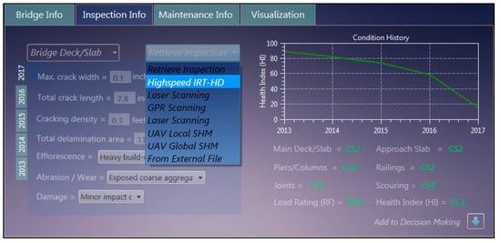 The implemented web-based tool uses element condition state limits defined by AASHTO Guide Manual for Bridge Element Inspection [] and calculates the Health index for each inspection year, as shown in Figure 7. In the implemented system, the element inspection data can easily be exported to formats compatible with federally used bridge management software such as AASHTOWare BrM [] and LTBP InfoBridge [].