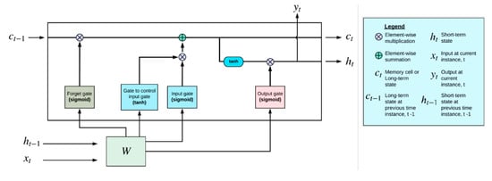 Diagram of a typical LSTM cell [] (when data are received, input gate controls what information is stored in the long-term state, forget gate determines how long the stored information is preserved across the time instances, and lastly, the output gate controls the requested information at a particular time step).