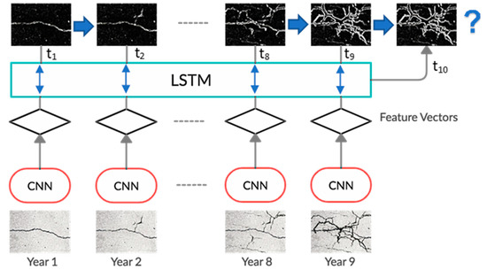 The proposed hybrid architecture (CNN–LSTM) works as follows: CNN–LSTM inputs the NDE data as an image format and passes it through the convolutional layers of CNN, in which the underlying spatial features are extracted and stacked in a one-dimensional vector. Then, the LSTM cells receive these feature vectors and make a prediction at a point in time. While the CNN branch of the model extracts the spatial relationships, LSTM creates a temporal context. Thus, these hybrid architectures are often called spatial-temporal neural networks. An important advantage of CNN–LSTM is that a time series prediction of spatial data can be performed in a single, end-to-end system instead of using two separate suboptimal systems. In the example shown in Figure 10, crack images belonging to inspections at different years are processed first in the CNN layers. The spatial features of crack deterioration extracted from CNN are then stored in LSTM cells. The output gate of the cell gives the predicted condition of the crack at the requested point of time.