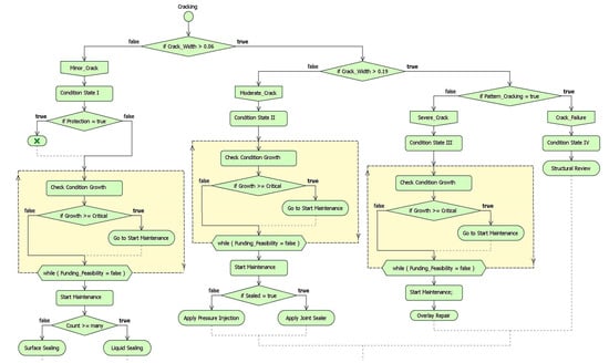 The decision selection was implemented inside the decision trees, allowing each deterioration mode to be analyzed inside decision loops. Once the strategy is selected and the funding availability is approved, detailed maintenance actions are automatically generated. An example decision action tree for bridge deck concrete cracking according to maintenance practice of FDOT is given in Figure 14. The maintenance practice is based on the FDOT Bridge Maintenance and Repair Handbook []. In the decision tree, first, the condition of the cracking is determined, and then the availability of funding is checked through the decision ranking. Until the bridge reaches the target priority, the associated maintenance actions are awaited. Once the funding becomes available (i.e., the bridge falls inside the target ranking), conditional maintenance actions are suggested to the infrastructure owner. For instance, minor cracking damage on the deck surface can be repaired using a liquid sealer if there are many cracks. On the other hand, a moderate crack should be repaired with pressure injection if the sealing was not previously made.