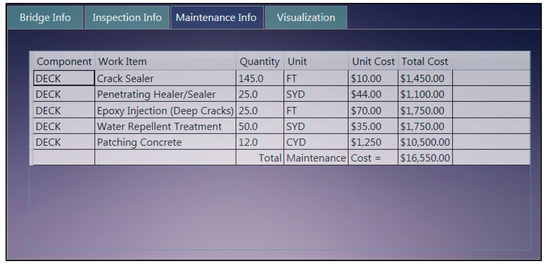 The maintenance strategy generation was also integrated into the web-based system implementation, as shown in Figure 15. The system automatically generates suggested maintenance/repair strategies based on the predefined repair pricing input and the decision tree algorithm used for each deterioration mode. However, it is possible to generate optional strategies based on different decision criteria selection. The system will modify the suggested maintenance actions. The user can also manually change a particular action in the maintenance suggestions and update the cost calculation according to the user-defined unit price list. The maintenance suggestions and the corresponding unit costs were obtained from NCHRP Final Report 668, “Framework for a National Database System for Maintenance Actions on Highway Bridges” []. In the shown example, the NDE data belonging to high-speed IRT deck scanning were imported to the system, and the suggested maintenance actions for cracks and spalling were automatically generated using the decision trees (it was assumed that this bridge was assumed high priority in the decision ranking). Then, a cost summary is shown to the user indicating the individual cost items for each maintenance action. In this particular NDE inspection, repair for spalling was shown as the major cost item.
