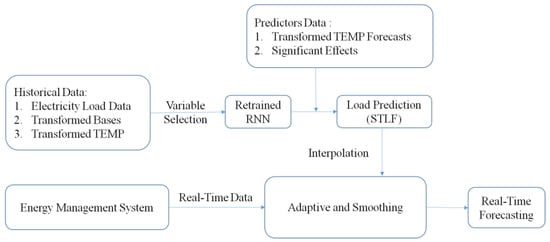 The proposed RNN-based STLF procedure, with selected bases through a semi-parametric model and a real-time load forecast adjustment scheme, is shown in Figure 1. In the first stage, forecasts of daily load patterns up to the next seven days are obtained using the apparent temperatures predicted by the Taiwan Central Weather Bureau (TCWB). In the second stage, based on past-forecasted results, real-time adapted forecasting load sequences are generated through the interpolation method using real-time adaptation and an exponentially weighted moving average (EWMA). Figure 1 presents the data flow of the proposed RNN-based model.