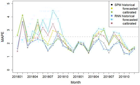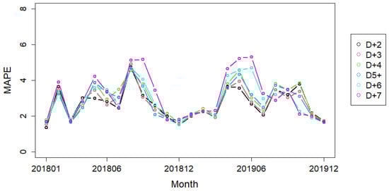 Figure 10 presents the monthly averages of the (D + 2)-day to (D + 7)-day forecasting MAPEs of the RNN models with forecasting temperatures from 2018–2019. Note that the seasonal patterns appear in both years, and, as they are the (D + 2)-day to (D + 7)-day forecasts, the higher MAPEs due to longer-range forecasts are to be expected.
