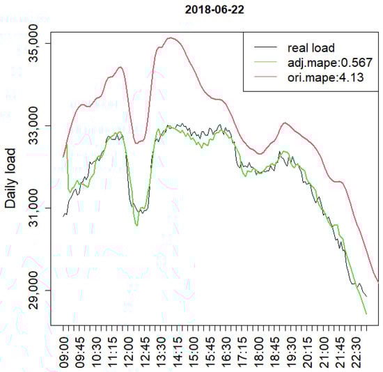 Figure 6 shows the performance of the model for a typical day of the studied period, June 22. As can be seen, the real time load pattern and the forecasting load pattern of the RNN model have similar trend patterns, but the forecasted curve is much lower. With the adjusted model, , however, the forecast accuracy improves significantly, obtaining an average error of 0.567% across the entire day.