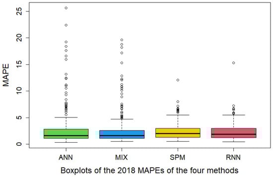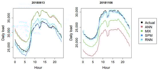 Figure 8 presents the boxplots of daily MAPEs in 2018, after deleting the two days mentioned above. The performances of SPM and RNN are shown to be generally more robust, with fewer extremely large MAPEs. Figure 9 provides two subfigures with the actual and forecasted loads in two of the days where both ANN and MIX have large biased forecasts.