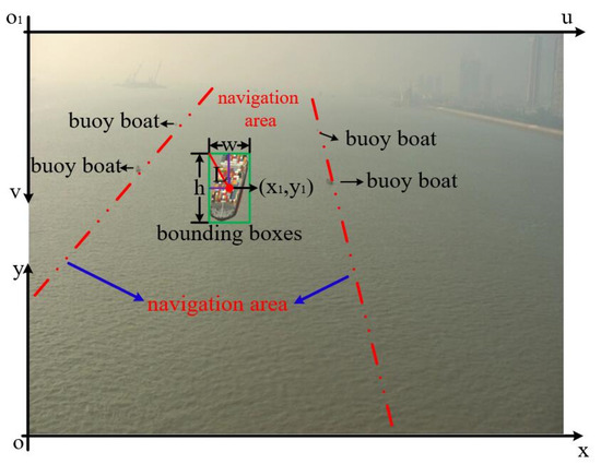 Sailing ships need to follow navigation rules, and they must navigate within the area marked by the buoy boats. Both lines connecting the position of the buoy boats refers to the red dashed line in Figure 4. Passing ships must navigate within the area enclosed by the two red dotted lines. We considered the posture of the simulated ship fixed due to the unchanged sailing direction. Next, we analyzed the trajectory of the simulated ship in the background image, as shown in Figure 5.