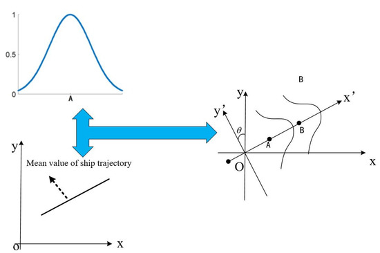 where is the coordinate of the simulation ship in the background image, and is the coordinate of the simulation ship after the degree rotation of the coordinate axis. The trajectories of the ships in the maritime scene are distributed around the X-axis. Firstly, we calculated the mean value of the ship’s trajectory, and then the navigation coordinates of the SRS image were obtained by adding Gaussian distribution parameters. The trajectory of the simulation ships in the real scene can be calculated through this method.