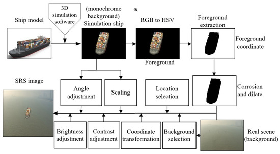 This paper used different kinds of real ship images, which are taken from real experiment scenes as samples to design simulated ship models with 3D software. We then obtained many 3D ship data by changing the parameters in the 3D software. After the 3D data were converted into 2D data, the 2D simulation ship data weresuperimposed into the real scene background to form an SRS image, and we annotated the SRS image with the automatic annotation algorithm at the same time. The main workflow is shown in Figure 1.