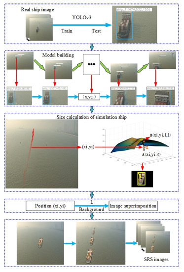Simulation ships in SRS images have three elements: trajectory, size, and posture. The experiments in the experimental scenario are shown in Figure 2; the observation perspective does not change in this scene, and the navigation posture of the ship is assumed to be unchanged or slightly changed. We needed to select the sailing posture before the experiment. The size L of the ship is related to the position of the simulated ship in the background image. In the experiment, we used the YOLO algorithm [12] for modeling, as shown in Figure 7. Coordinates (x1, y1) and L are used to form three-dimensional coordinates (x1, y1, L1) which are the position of the ship in the SRS image. Then, we used the YOLO algorithm to count the data (x1, y1, L1) of 100 ships (cargo ships, passenger ships, sand ships, and small ships.) in the experimental scene, and performed modeling. We determined L by simulating the position of the ship (xi, yi). Finally, the ships’ trajectories were determined based on the voyage data of 100 ships in the experimental scene. The overall flow chart of the SRS image generation method is shown in Figure 7.