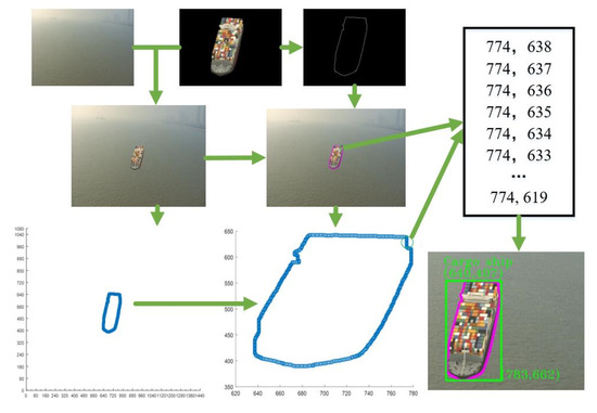 It often takes dozens of mouse clicks or more to complete a ship annotation. The annotation is affected by the annotated image’s pixels, which often differ significantly from the actual outline. This paper proposes an automatic annotation method for annotating batch image data. The main flow chart of the proposed annotation method is shown in Figure 8.