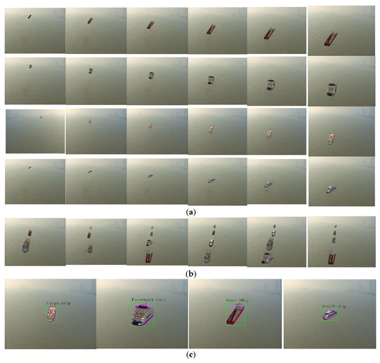 where and represent the focal length of the camera in terms of pixel dimensions in the and direction, respectively, and is the principal point in terms of pixel dimensions. The size of the ship in the image is changed by adjusting the focal length of the camera. Besides the internal parameter matrix of the camera, Formula (2) also involves the rotation matrix and translation vector. The rotation matrix represents the camera’s shooting angle, and the translation vector represents the shooting position of the camera. The ship images from different perpectives can be generated by changing the shooting angle, location of the camera, and focal length. Therefore, we obtained abundant target ship images.