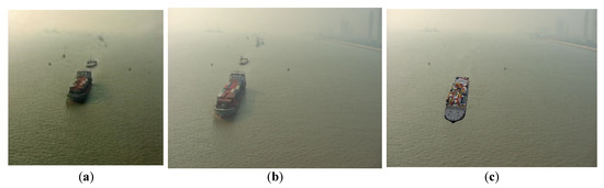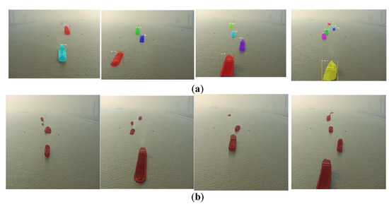 In this experiment, we used two annotation methods to label the four kinds of ships, as shown in Figure 10c. The annotation methods, bounding box method (green box in Figure 10c), and outline method (red line in Figure 10c) were used to label SRS images. Simultaneously, the names of the targets were displayed on the top left of the labeled targets.
