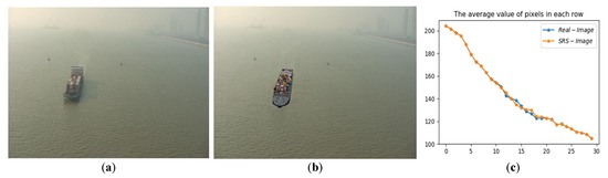 The similarity between the SRS images and the real ship image is the key of the study. We selected a real ship image and an SRS image with the same background to detect the similarity between both. Figure 13a is a real ship image, and Figure 13b is an SRS image. We took pixels as the research object for modeling. The average value of each row of pixels in the two images was calculated (Figure 13c). The results show that the designed SRS images have a high similarity with the real ship image.