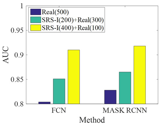 Table 1 shows the results of different detection methods combined with various image dataset. According to the results of FCN, “SRS-I(400) + Real(100)” achieves the highest accuracy rate (91.3%), followed by “SRS-I(200) + Real(300)” (88.5%), “Real(500)” (84.2%), “SRS-I(400) + Real(100)” (TPR: 92.8% and FPR: 9.2%) outperformed the compared methods, as confirmed by the results of the true positive rate (TPR) and false positive rate (FPR). The FPR of the proposed method was the lowest among the compared methods.Moreover, “SRS-I(400) + Real(100)” demonstrated the highest AUC (0.910). Therefore, the dataset generated by the proposed method was more effective than the real dataset selected by us (Figure 14). The detection results of Mask RCNN, “SRS-I(400) + Real(100)” achieved the highest accuracy rate (92.9%), followed by “SRS-I(200) + Real(300)” (90.6%), “Real(500)” (86.3%).