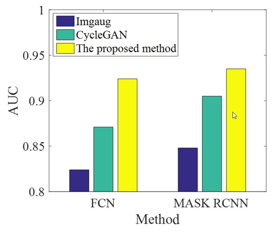 Table 2 shows the results of different detection methods combined with various image datasets. According to the results of FCN, the proposed method achieved the highest accuracy rate (93.2%), followed by CycleGAN (90.9%), Imgaug (85.7%). The proposed method (TPR: 94.4% and FPR: 7.1%) outperformed the compared methods, as confirmed by the results of the true positive rate (TPR) and false positive rate (FPR). The FPR of the proposed method was the lowest among the compared methods. Moreover, the proposed method demonstrated the highest AUC (0.924). Therefore, the dataset generated by the proposed method was more effective than other compared datasets (Figure 16). The detection results of Mask RCNN, the proposed method achieved the highest accuracy rate (94.6%), followed by CycleGAN (91.7%) and Imgaug (87.3%).