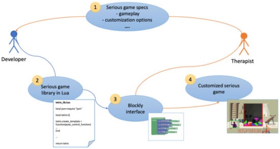 Once these parameters are selected, the developer implements the serious game application in Lua. In addition, the developer implements a simplified Blockly interface so that therapists can customize the serious game in a simplified manner, without changes to the Lua code.