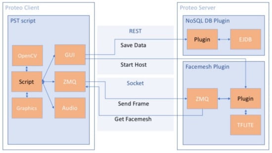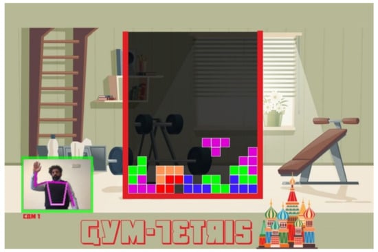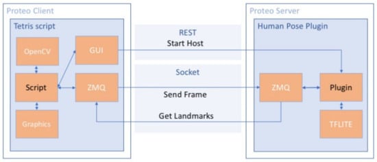 GymTetris is based on the popular Tetris game (https://en.wikipedia.org/wiki/Tetris, accessed on 11 May 2021) and was conceived to encourage physical exercise. This serious game follows the dynamics of the classic game, but the user moves or rotates the tetrominoes by means of body movements. A scheme of the Proteo modules used to develop the game is shown in Figure 2.