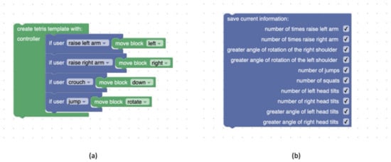 As previously discussed, the game template provides a base that the therapist can customize while considering the needs of the user to which the game will be deployed. In the case of GymTetris, the game can be customized in terms of user interaction and data collection: the therapist can choose which body movements must be performed by the user to interact with the game by using the Blockly [28] editor (Figure 3a). Moreover, the therapist can decide which user data to collect during the game sessions (Figure 3b).