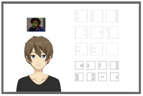 In this case, the therapist can choose the images needed for a specific task and how to analyze user performance and collect data but can also decide how and if the avatar should interact with the user. Here, the user interaction to choose the correct image to complete the series is conventionally based on conventional mouse interaction, however, the actions of the avatar can be activated by more natural input modalities, for example, by the user’s level of attention. This kind of avatar interactivity has indeed been proven to be very important to enhance human–computer interaction [30], especially for users with an attention deficit [31].