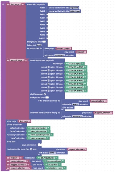 Even if Blockly is capable of reproducing each of the Lua language constructs, it is specifically intended for users with no development skills. In the context of telerehabilitation, we considered therapists or researchers that often need to set up task batteries (in the form of serious games), which is typically unfeasible without support from developers. With Blockly, starting from a serious game template, we give them the possibility to overcome technical skill barriers and to reach autonomy. In Section 2.2. we present some examples of the process of building a serious game starting from a template.