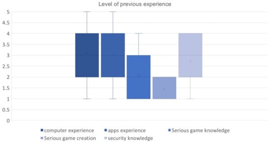 In Table 2 and Figure 8, all conditions (Computer experience, Apps experience, Serious game knowledge, Security rules knowledge) were reported as presenting an intermediate level of Knowledge (out of 3 points). Their level of Serious game creation knowledge was considered low.