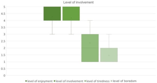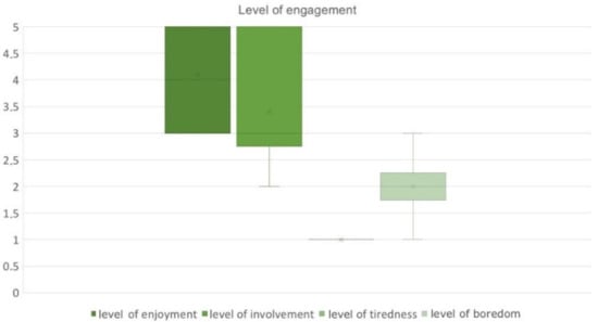 Regarding the level of user involvement (Table 2 and Figure 12), the conditions of positive feeling (the level of enjoyment and level of involvement) were reported as high (out of 4 points) while the conditions of negative feeling (boredom and tiredness) were reported as low (1 or 2). Concerning engagement (Table 2), in all conditions Pairwise comparisons revealed that enjoyment and involvement were significantly higher than tiredness and boredom (enjoyment vs. tiredness: (z = −2.99; p < 0.001, d = 0.94), enjoyment vs. boredom: (z = −2.771; p < 0.009, d = 0.87), involvement vs. tiredness: (z = −2.92; p < 0.009, d = 0.90), involvement vs. boredom: (z = −2.673; p < 0.004, d = 0.88).