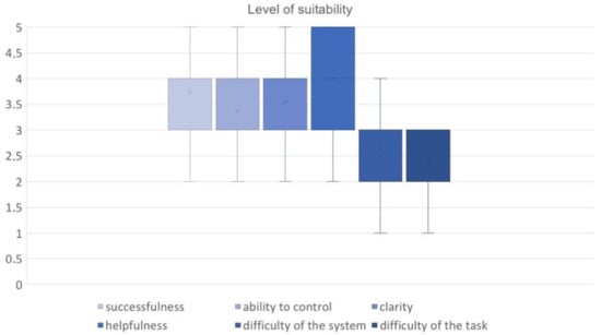 Concerning the user level of suitability (Figure 10), the conditions of successfulness, ability to control, clarity, and helpfulness were reported as high (between 3 and 5), while the difficulty of the system and the difficulty of the task were reported as low. Pairwise comparisons with the Wilcoxon signed-rank test revealed that the first four conditions were significantly lower than the last two: difficulty of the task with successfulness, ability to control, clarity, and helpfulness, respectively: z = −1.951; p < 0.09, d = 0.51; z = −1.54; p < 0.07, d = 0.49, z = −1.799; p < 0.05, d = 0.59 and z = −2.36; p < 0.009, d = 0.75, and the difficulty of the system with successfulness, ability to control, clarity, and helpfulness, respectively: z = −1.83; p < 0.09, d = 0.53; z = −1.49; p < 0.08, d = 0.49, z = −1.83; p < 0.03, d = 0.61 and z = −2.41; p < 0.009, d = 0.81.