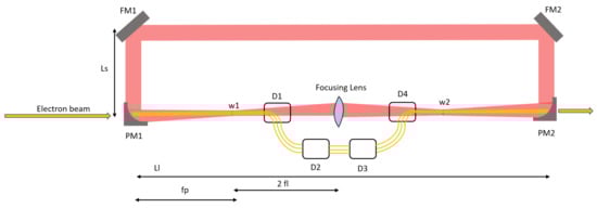 This design allows obtaining two waists of the laser beam along a straight line, which is as well the direction where an electron beam is injected while counter-propagating with respect to the laser. The electron beam interacts at the first laser waist and then at the second waist , with the emission of FEL radiation. The length of the cavity is , the long side being and the short one . A focusing lens is placed between two parabolic mirrors at a distance from both. Denoting with the focal length of the parabolic mirrors and with the focal length of the central focusing lens, the relative distance between one laser waist and the central focusing lens is . Furthermore, the following equation must hold . After the first interaction the electron beam passes through the magnetic chicane (composed by the four dipoles D1, D2, D3, D4) during the time , finally reaching the second interaction point. This time must be synchronized to the laser pulse in such a way that the two beams can “meet” at the waist , in formulas we obtain , with c the speed of light in vacuum. The strength parameter of the wave undulator is defined as: