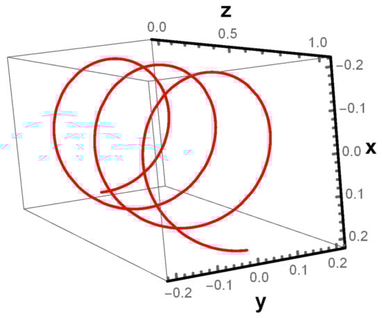 Carrying out the time derivative , yields an expression for the invariant , evaluated at the origin of times: , with the initial Lorentz factor. Equations (20) describe the motion of a free electron under the influence of the wave undulator. In the case of a circularly polarized wave undulator the electron trajectory is of the kind shown in Figure 3, obtained plotting Equation (20) for arbitrary parameters to provide a visual example.