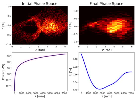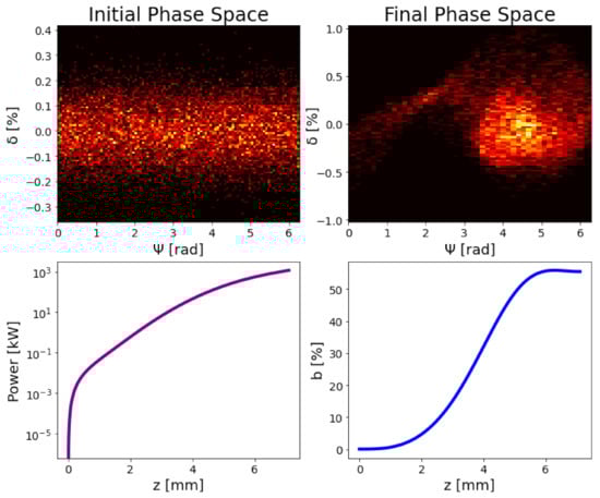 We have developed a numerical code in Python for solving the 1D FEL Equation (23) and to propagate the electron beam from one interaction point to the other self-consistently via Equation (28). This choice has been made (instead of using other available codes) to have more control on the approximations done in the model and in such a way to easily extend it for the forthcoming works where the design will be reconsidered including further effects towards an even more realistic description of the machine. In this section we report on simulation results, in particular showing the longitudinal phase-space evolution of the electron beam while interacting with the electromagnetic undulator and with the magnetic chicane. The parameters used for the chicane considered in this paper are m, mm, mm, mm, T and . The chosen length of the dipoles has been mm and the reciprocal distance mm. Considering an electron bunch of duration 300 fs and charge the correction due to CSR is , which is not fully negligible, and it has been implemented in the Python code. The effect of the energy losses due to CSR in the magnetic chicane onto the bandwidth of the wave undulator FEL spectrum is not the main goal of the present paper, but it shall be addressed in a future work. The first result is given in Figure 4, showing the randomly distributed initial longitudinal phase-space relative to one bucket of ponderomotive phase (top-left), the bunched longitudinal phase-space after the interaction with the laser at the waist of Figure 1 (top-right), the emitted FEL power during the interaction with the CO laser over one Rayleigh length (bottom-left), and finally the evolution of the bunching factor over the same length (bottom-right). The pixel level in the top-left and top-right figure is in arbitrary units but the two plots are normalized on the same scale.