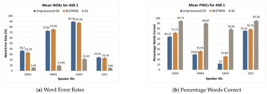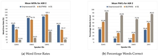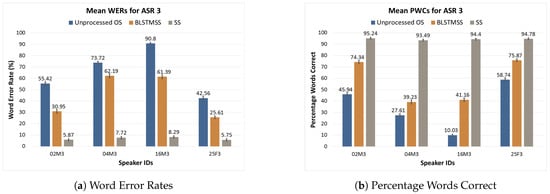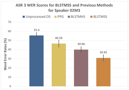 In our previous studies [,], we worked with speaker 02M3 and ASR 3. Figure 5 shows the WER scores of BLSTMSS in comparison to our previous methods, PPG [] and BLSTMHS []. It can be observed that the proposed system was able to significantly reduce ASR errors in comparison to previous methods.