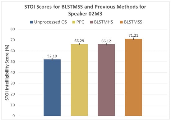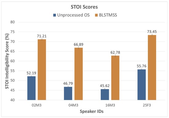 Like the ASR, we compared the STOI scores of the proposed system with those of our previous methods (see Figure 7). The references used to calculate STOI were the same duration–matched SS signals. The proposed system has higher STOI scores (about 5%) compared to previous systems and unprocessed OS.