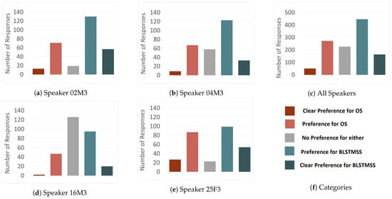 Overall, the most chosen option was ‘Preference for BLSTMSS’ as can be observed in Figure 8c. There were more responses in the ‘Clear preference for BLSTMSS’ and ‘Preference for BLSTMSS’ categories compared to ‘Clear preference for OS’ and ‘Preference for OS’ categories, respectively. ‘Clear preference for OS’ was the least chosen option.