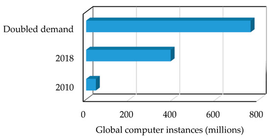 To sustain this growth in the global database and in user demand, the number of data centers and their energy consumption have been increasing. In 2018, it was estimated that data centers consumed 1% of all the global electricity generated. From 2010 to 2018, the number of computers skyrocketed (Figure 1) [2].