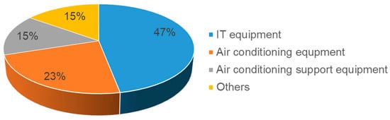 Despite this growth, it is estimated that due to the increase in efficiency from 2010 to 2018, the total energy to serve the data centers grew by only 6%, and this is directly explained by the better efficiency of the data center equipment. The energy consumption of a data center is 10 to 100 times greater than that of a standard commercial building of the same dimensions. In Leadership in Energy and Environmental Design (LEED) buildings, the average energy consumption with an electrical load of 68% of the buildings was 10.8 W/m2 [3]. According to the American Society of Heating, Refrigerating, and Air-Conditioning Engineers (ASHRAE), data centers are installations with an enormous demand for energy, highlighting the relevance of the theme. High-density data centers can reach 10,764 W/m2, although on average, their consumption ranges from 430 to 861 W/m2 [4]. Even though specific information technology (IT) equipment has evolved, within the data center, air conditioning systems are one of the main sinks of energy consumption. If energy consumption in data centers is considered of high relevance, the air conditioning topic becomes an indispensable item of discussion. On average, air conditioning systems are responsible for 38% of the energy consumption of data centers [5]. According to Santos et al. [6], the load distribution of a data center is distributed as shown in Figure 2.